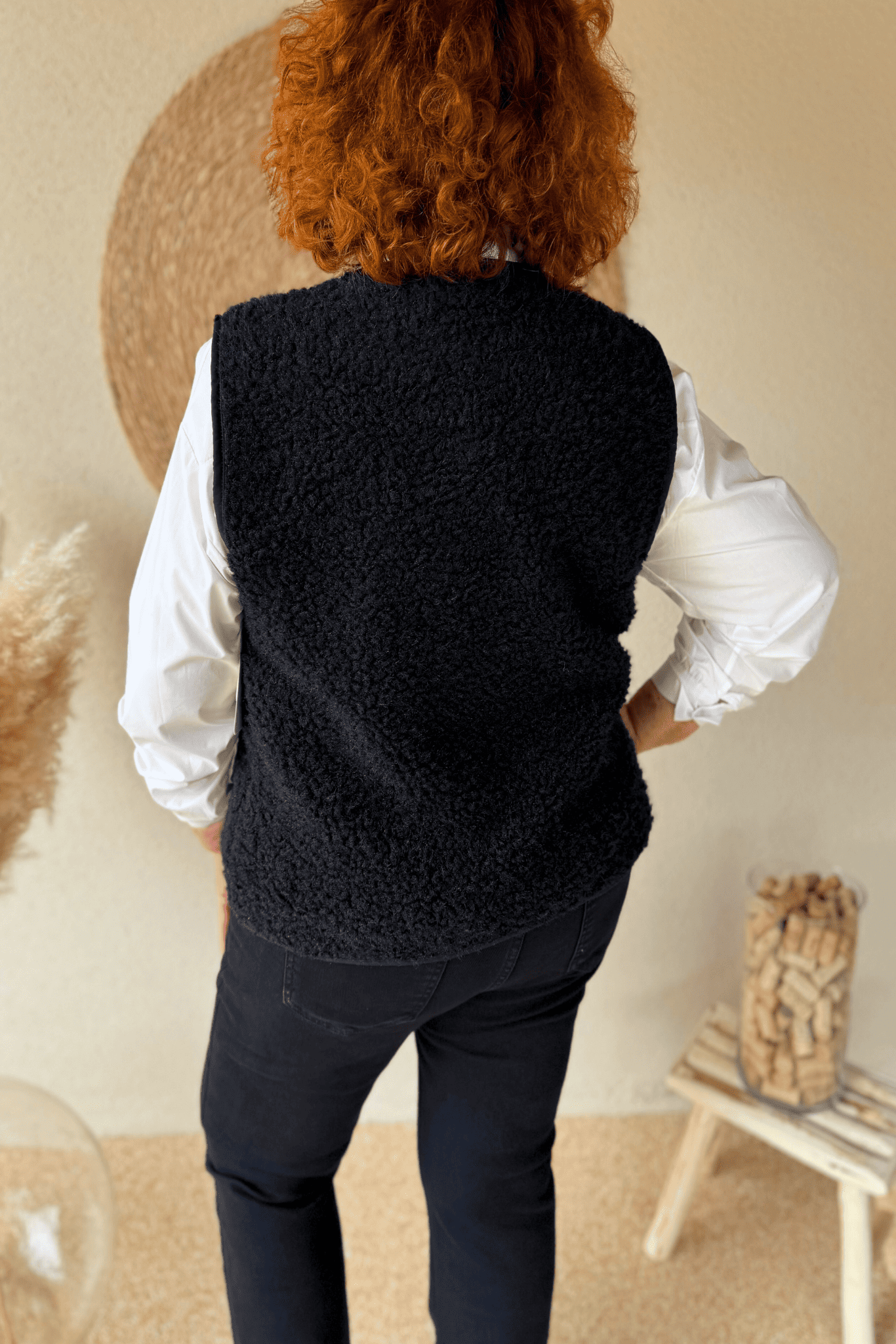Le gilet NERINA séduit par sa texture bouclette, à la fois douce et moderne, qui apporte une belle dimension à la silhouette.