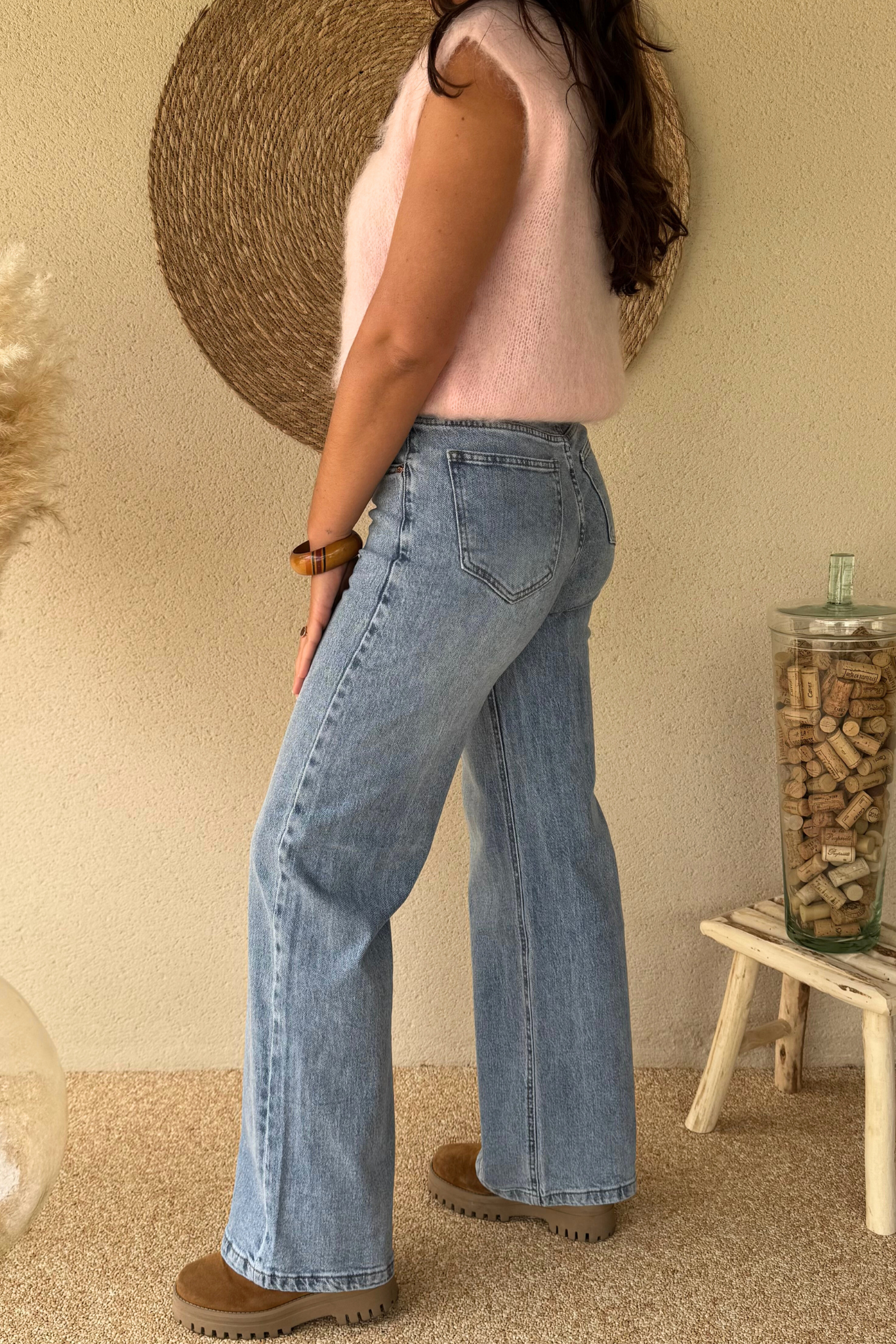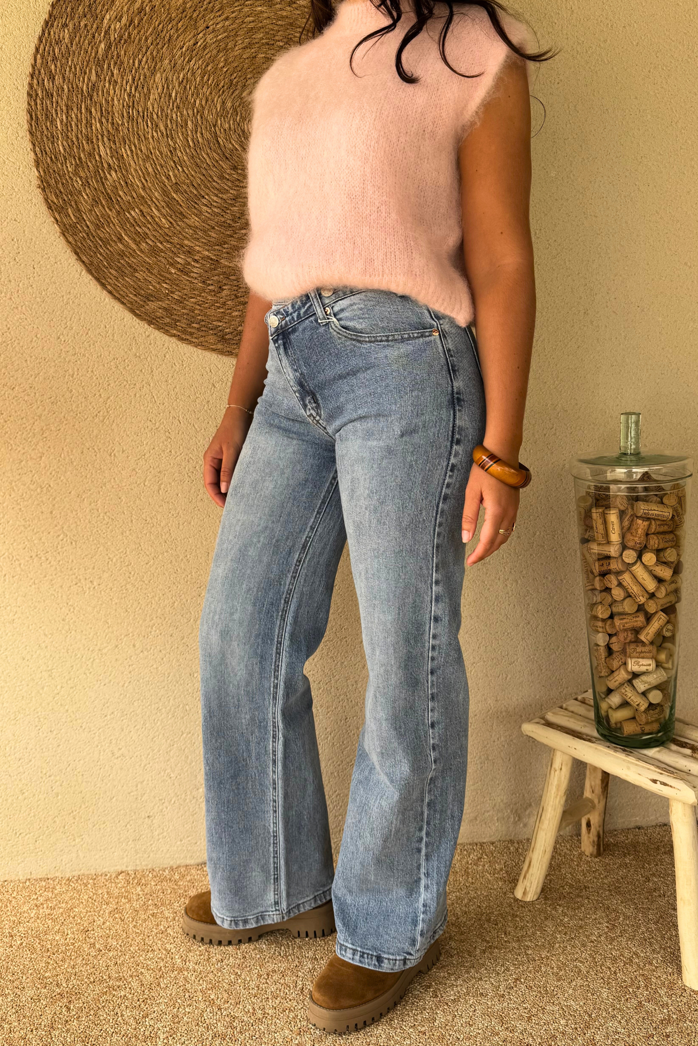 Le jean ELIO à la coupe wide leg séduit par son denim clair et sa taille mi-haute qui allonge la silhouette.