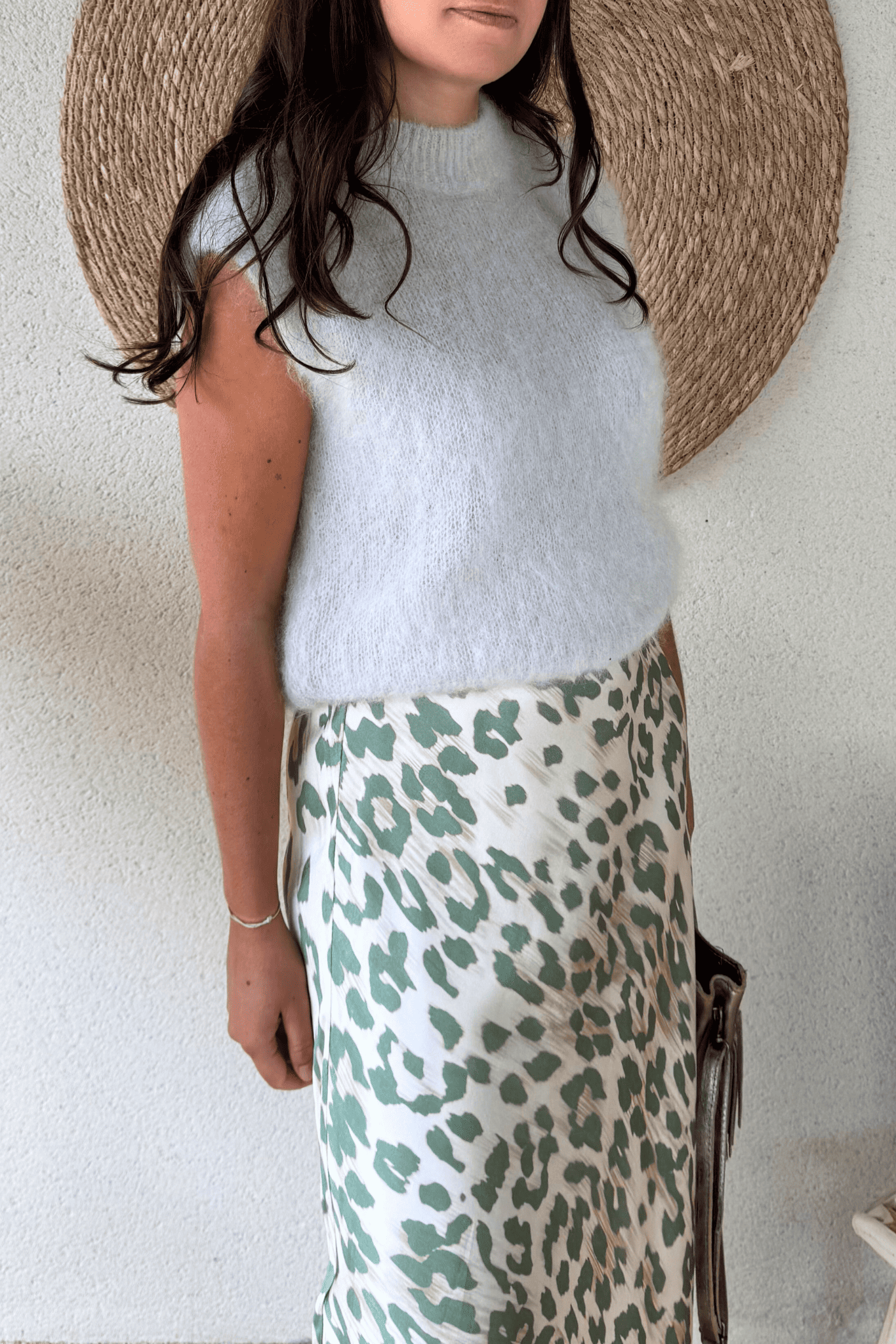 La jupe ALMA sublime la silhouette avec son tombé fluide et son imprimé léopard revisité dans des teintes douces et modernes.