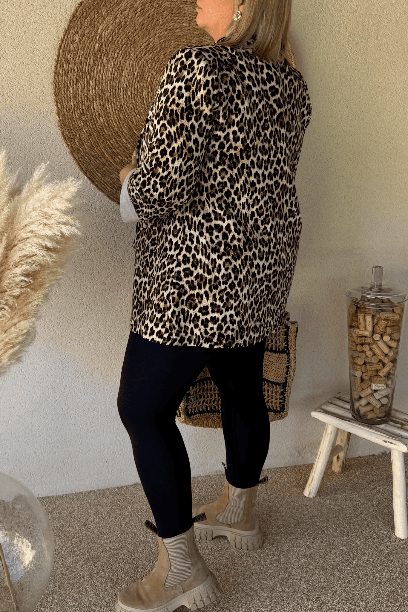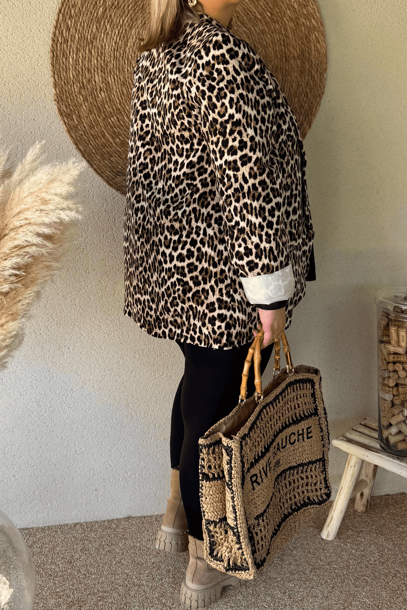 La veste de tailleur LÉONA ose l’imprimé léopard avec élégance. Sa coupe structurée apporte allure et modernité, tandis que son motif animalier insuffle une touche mode affirmée.
